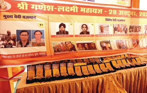 Then begins the worship of the sixteen kalashas (sacred vessels), followed by the collective chanting of Shri Suktam. After this, the Ganapati Atharvashirsha is recited. Once the recitation is complete, the main Yagya offerings commence, where 108 kunds resonate together with the sacred chanting of Ganesh Lakshmi mantras.