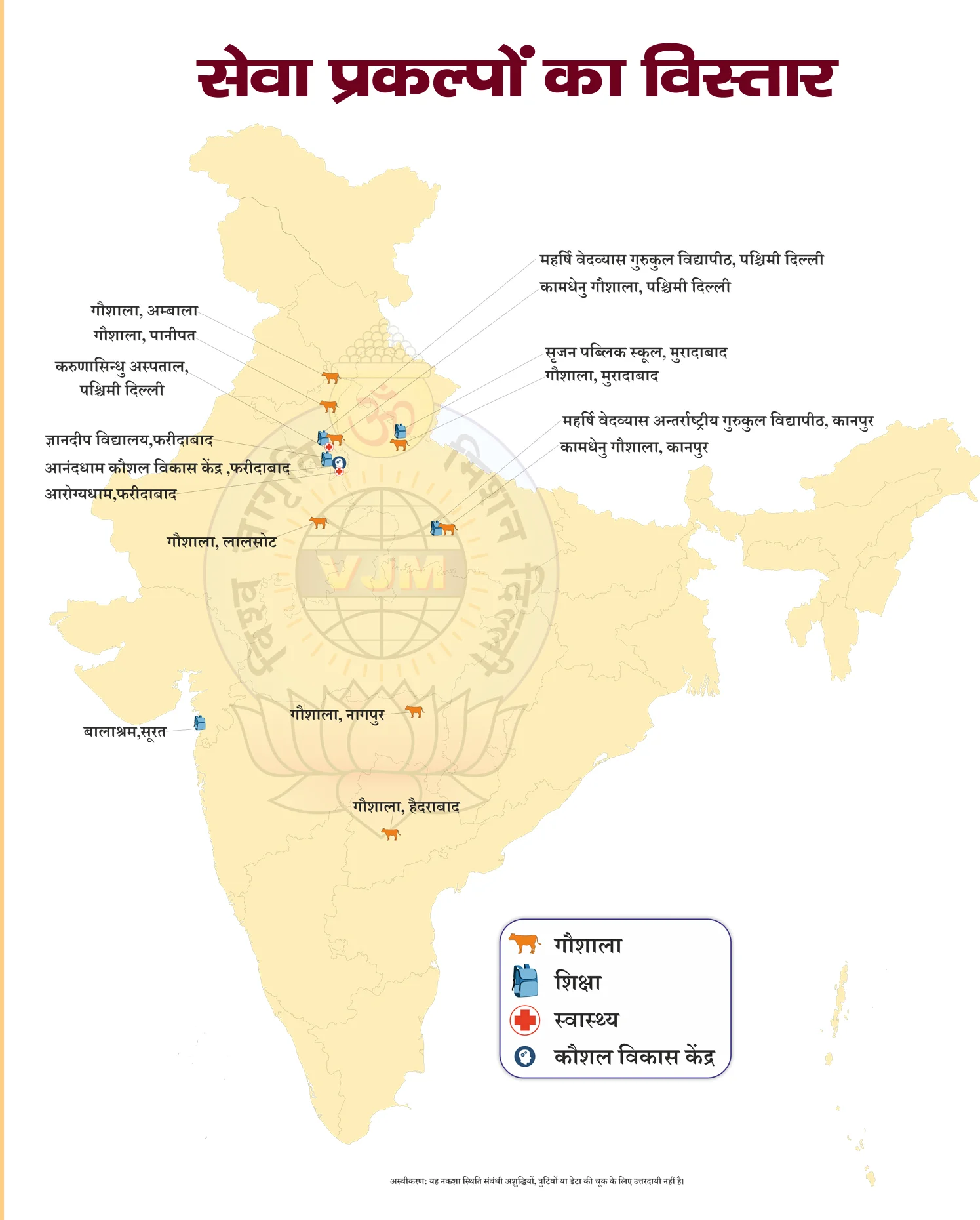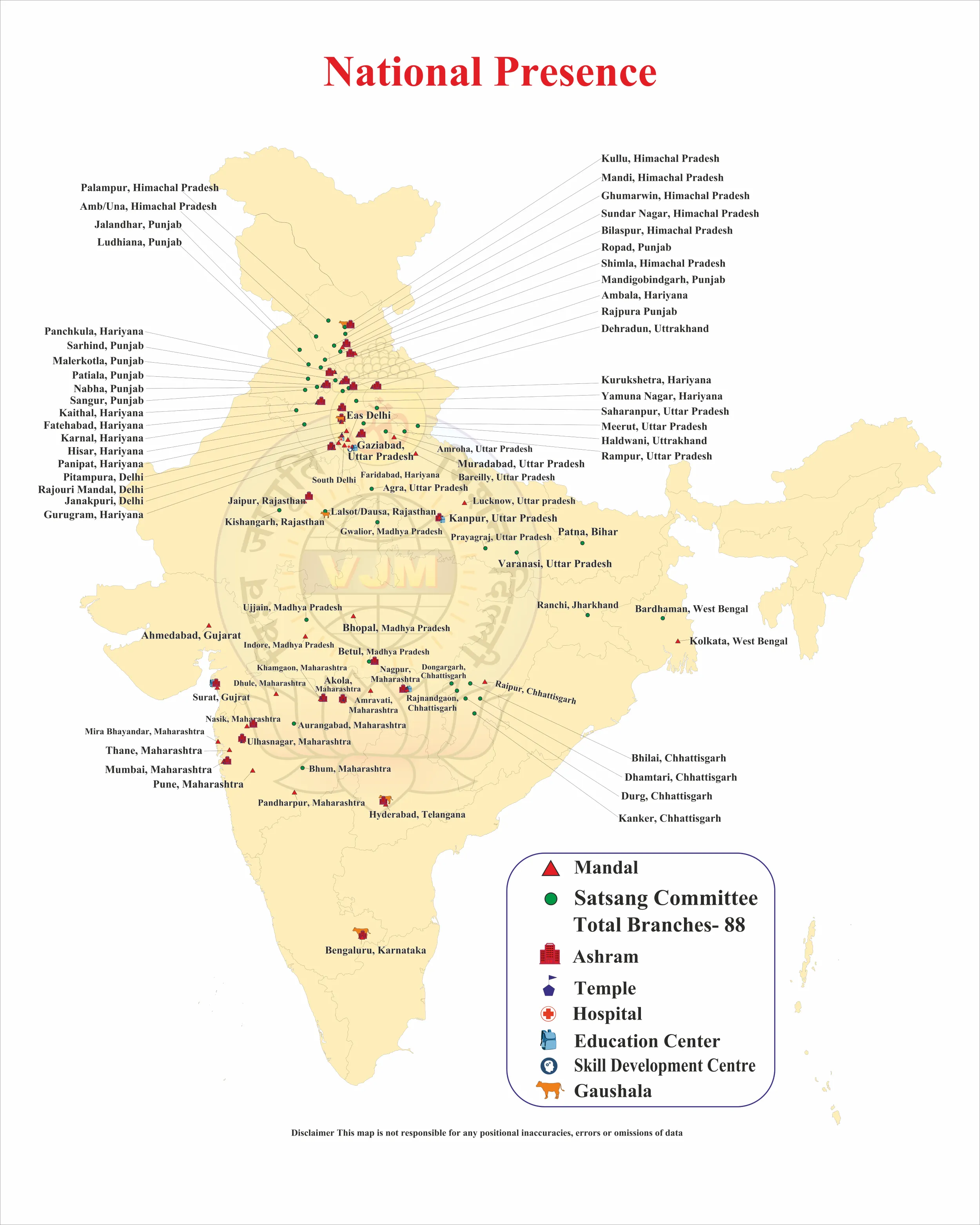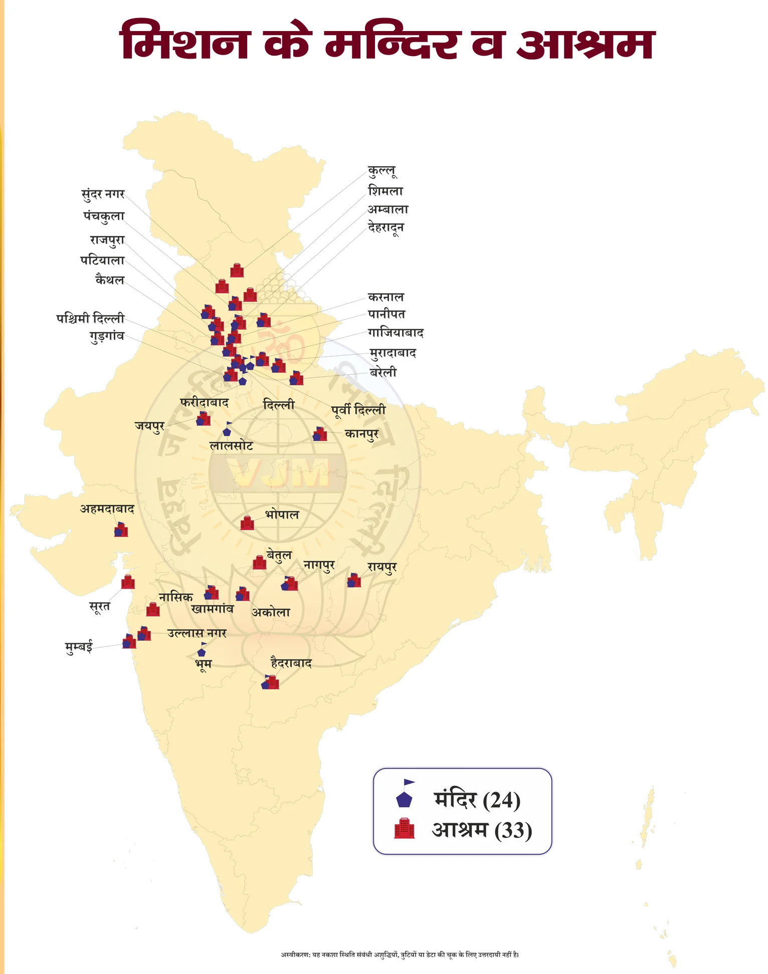 Vishwa Jagriti Mission has expanded its geographical area through its spiritual, cultural and service activities. The Mission has established many temples, meditation centres and ashrams across the country, where regular sadhna, satsang and service activities are conducted.