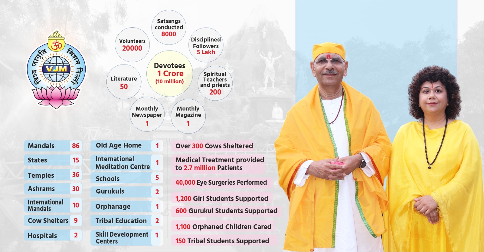 Since 1991, the Vishwa Jagriti Mission has scripted many milestones in seva, sadhana, and sanskar. Today, more than 10 million followers are associated with its vision, supported by over 100,000 committed volunteers. With 86 national centers functioning across 15 states, it has also established 24 temples and 36 ashrams. The message of spiritual awakening now resounds not only in India but in 10 international chapters worldwide.