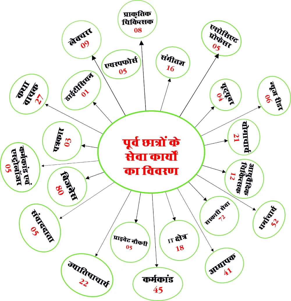 The students of Vishwa Jagriti Mission’s Gurukuls have carried forward the values of devotion, discipline, and service into diverse fields of society. As shown in the chart, former students have taken up impactful roles such as priests (कर्मकांड – 45), spiritual guides (धर्माचार्य – 52), social workers (सामाजिक सेवा – 72), and even educators (शिक्षक – 80), reflecting the mission’s deep focus on holistic development.
