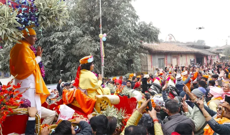 As part of the New Year celebration, a divine and joyful procession is held. Devotees gather together to welcome the new year with enthusiasm. Dancing and singing with devotion alongside the chariot of Sadguru Maharaj, the entire atmosphere becomes filled with spiritual joy.