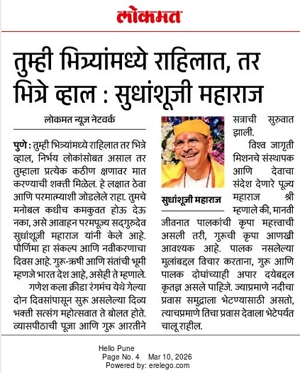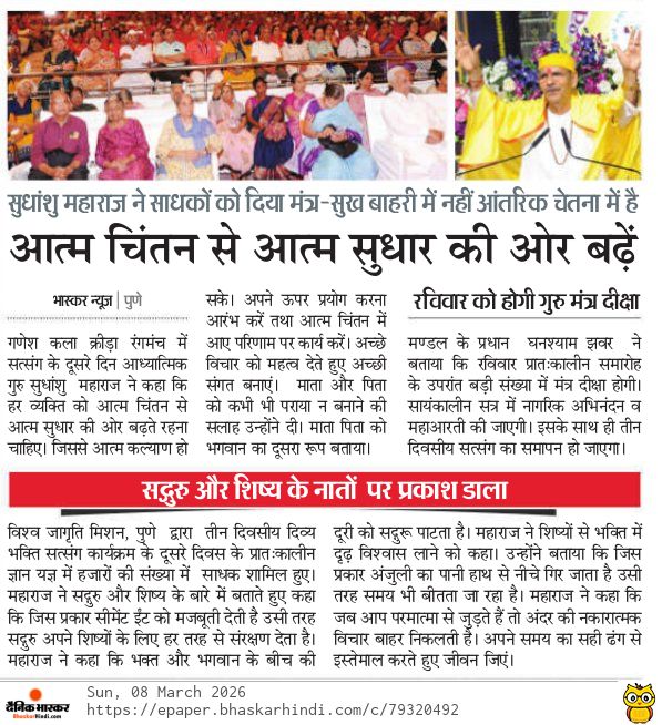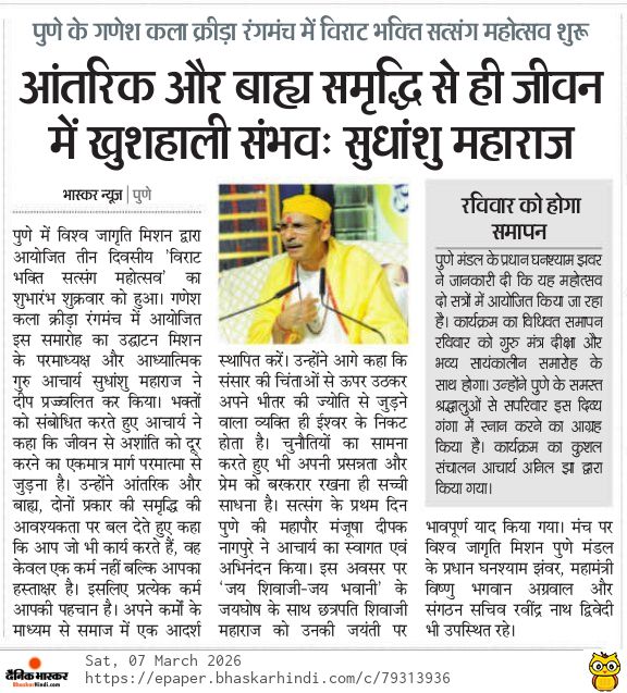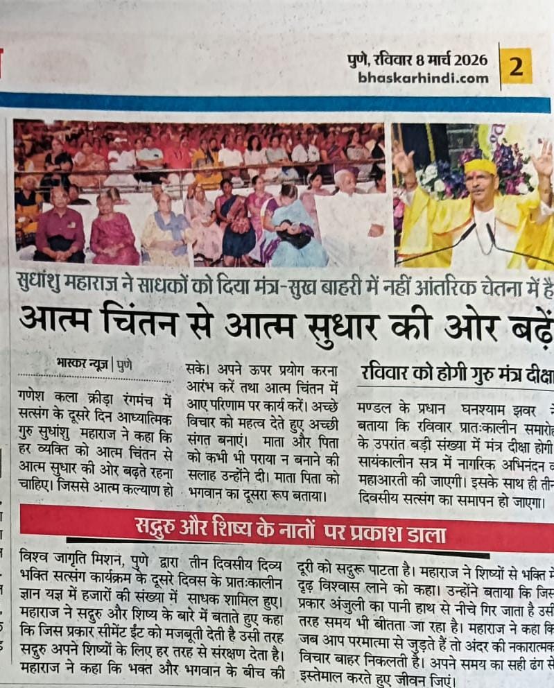 During a three-day devotional satsang at Ganesh Kala Krida Rangmanch in Pune, spiritual teacher Sudhanshu Ji Maharaj guided devotees toward inner transformation through self-reflection. He explained that real happiness is not found in external possessions but within inner consciousness. Thousands of seekers attended the knowledge session organized by Vishwa Jagriti Mission. The discourse highlighted the importance of good company, devotion, and the sacred Guru-disciple bond. Maharaj also encouraged people to use time wisely and strengthen faith, reminding them that spiritual awareness helps remove negativity and brings clarity, peace, and purpose in life.