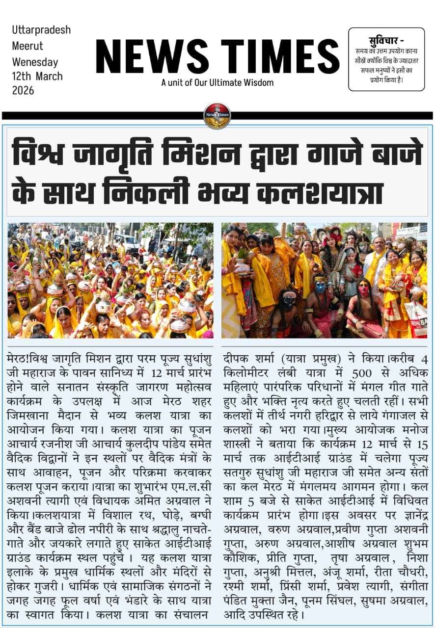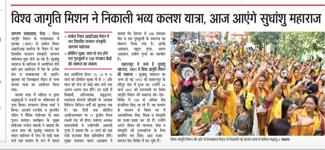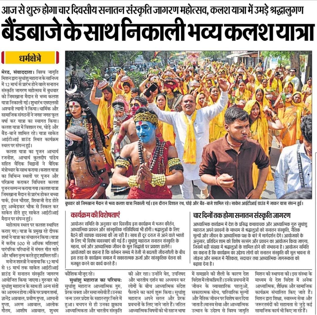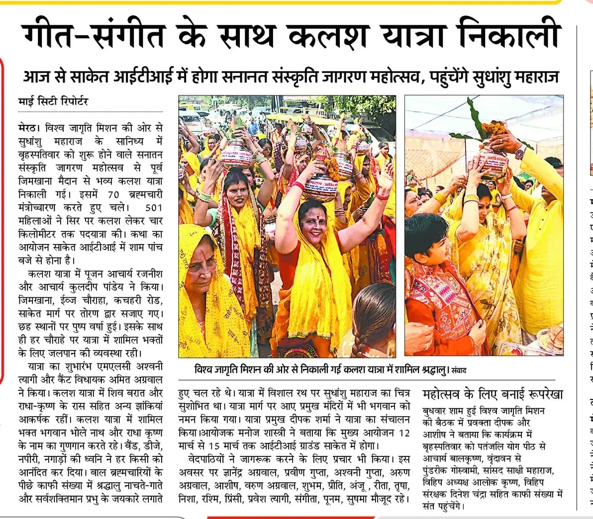 A grand Kalash Yatra was organized in Meerut under the auspices of Vishwa Jagriti Mission as part of its Sanatan Sanskriti Jagran program. This procession was organized to commemorate the event, which will begin on March 12th, under the auspices of His Holiness Sudhanshu Ji Maharaj. Over 500 women, dressed in traditional attire, participated in the approximately 4-kilometer journey, singing auspicious songs and displaying devotion. The Kalash were filled with Ganga water brought from Haridwar. The procession traveled through various routes of the city, reaching the venue. Devotees were enthusiastic on this occasion, and numerous social and religious organizations welcomed the procession with flower showers.