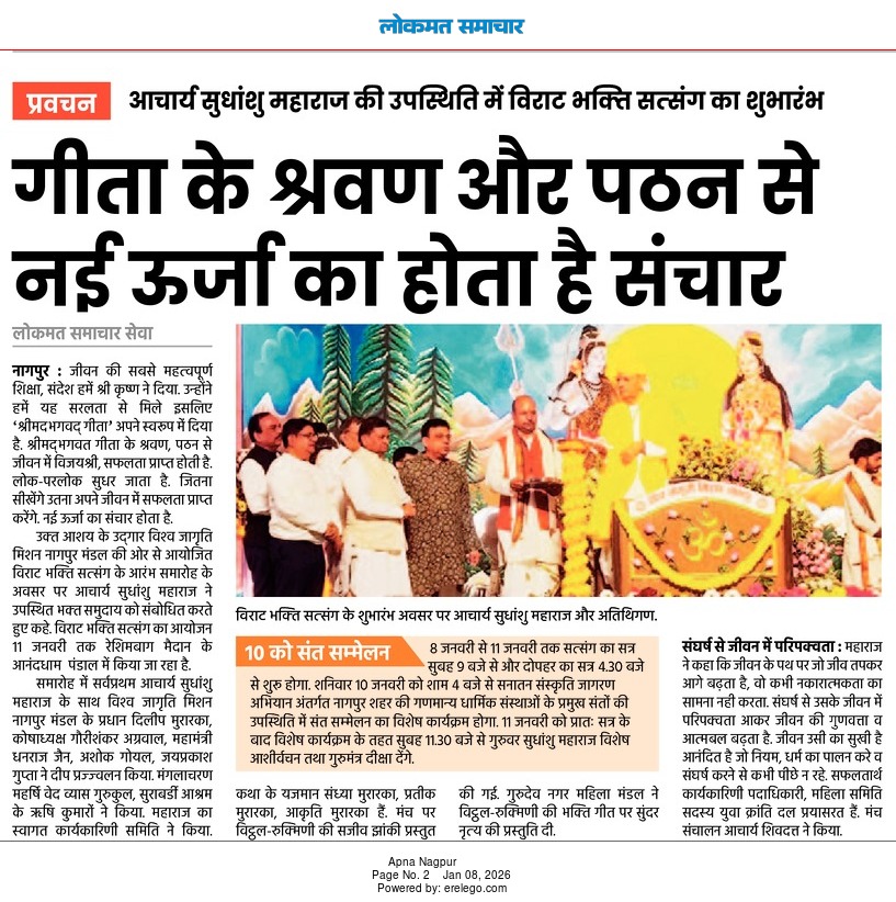 The nationwide Mission Satsang 2026 commenced at the Reshimbagh complex in Nagpur with the joyful presence of Rashtra Sant Sudhanshu Ji Maharaj. The morning ceremony was filled with devotion as the divine sound of Om Namah Shivaya echoed throughout the atmosphere. His Holiness said that challenges should be viewed not as burdens, but as means for self-development and refinement. He delivered an inspiring message emphasizing the purity of vital energy, true love, sweetness, and a life dedicated to righteous action.