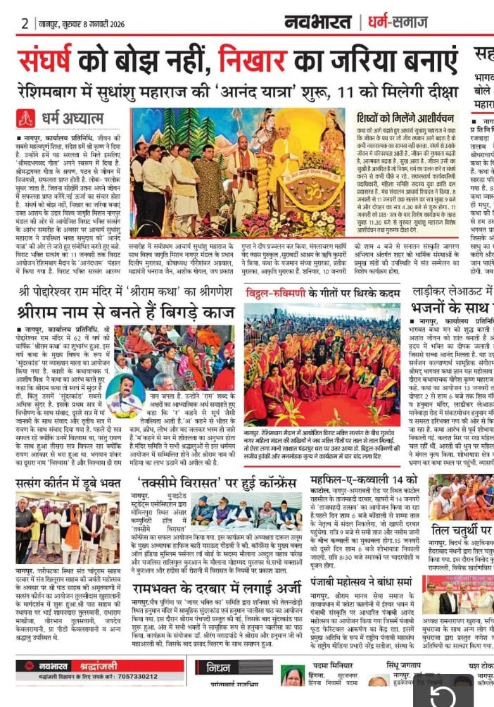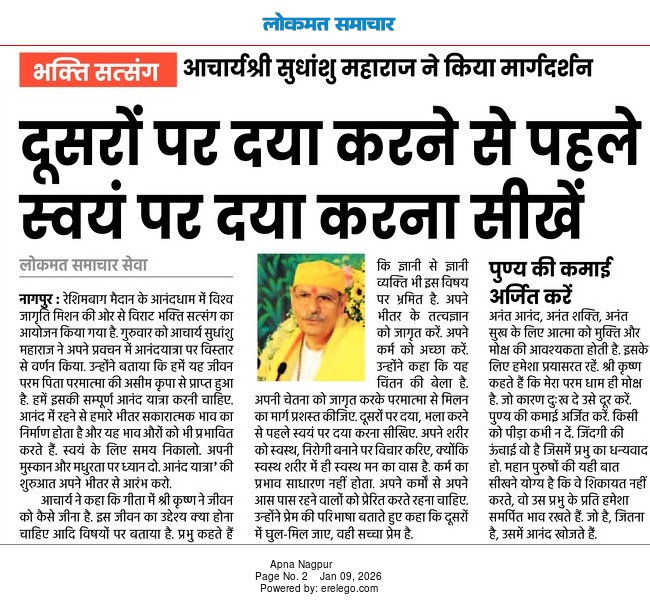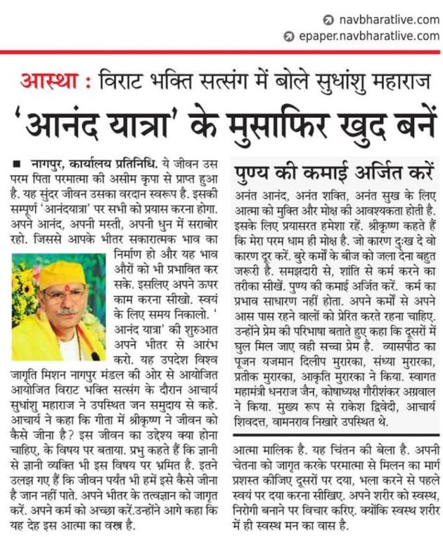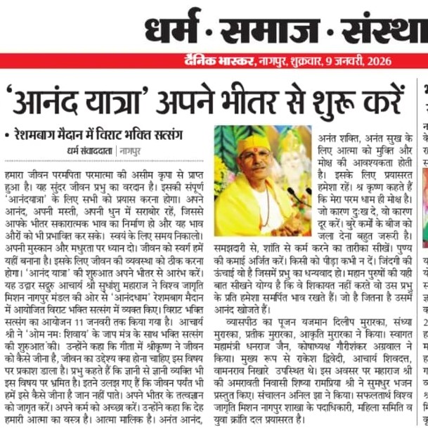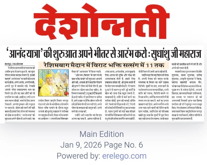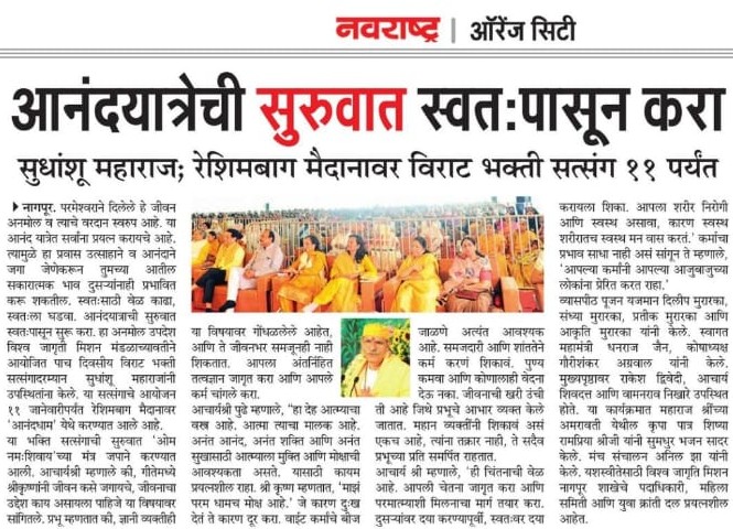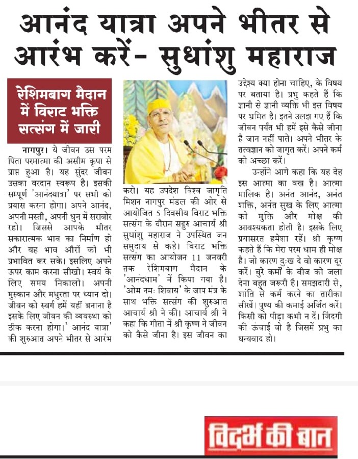 At the grand devotional gathering held in Reshimbagh Ground, Nagpur, Rashtra Sant Pujya Sudhanshu Ji Maharaj, while explaining the essence of life, said that true happiness is not found in external means, but is hidden within us. Only when a person adopts self-reflection, service, self-control, and a positive mindset does he experience lasting peace, balance, and joy in life. This satsang inspires spiritual awakening and life transformation.