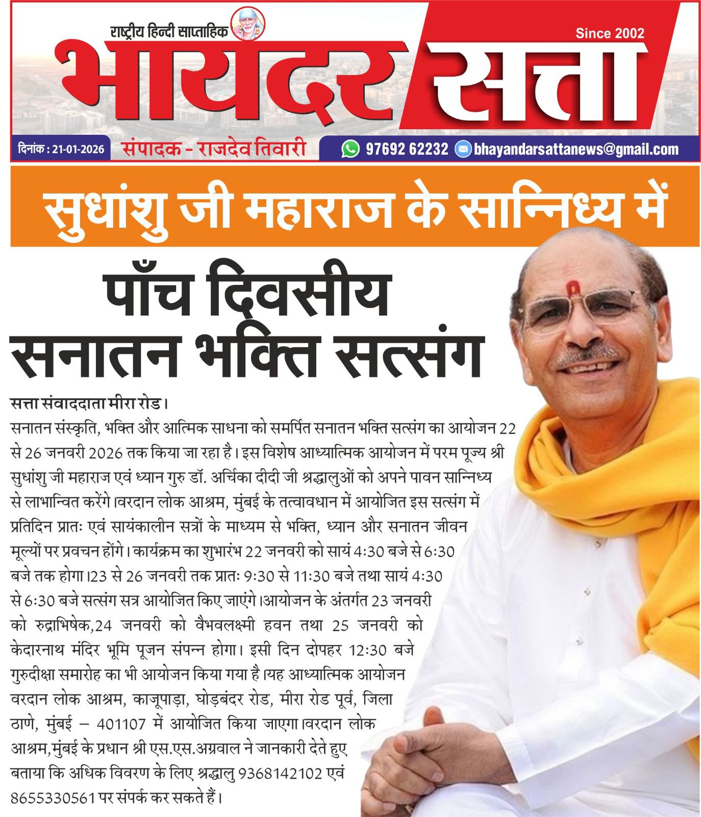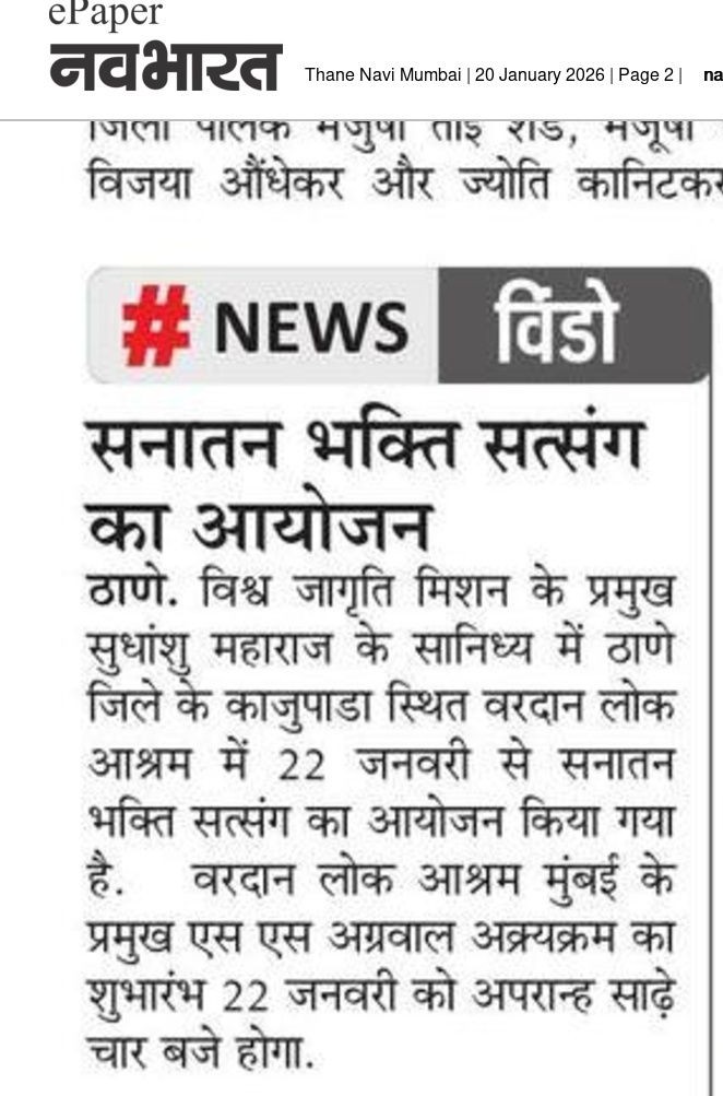 This five-day Sanatan Bhakti Satsang, dedicated to Sanatan culture, devotion, and spiritual practice, will be held from January 22nd to 26th, 2026, at Vardaan Lok Ashram in Mumbai. In this special spiritual event, the revered Sudhanshu Ji Maharaj and meditation guru Dr. Archana Didi Ji will bless the devotees with their divine presence. Through daily morning and evening satsangs, there will be inspiring discourses on devotion, meditation, self-realization, and Sanatan life values. The program will also include Rudrabhishek, Vaibhavalakshmi Havan, Kedarnath Temple Bhoomi Pujan (groundbreaking ceremony), and a Guru Diksha ceremony.