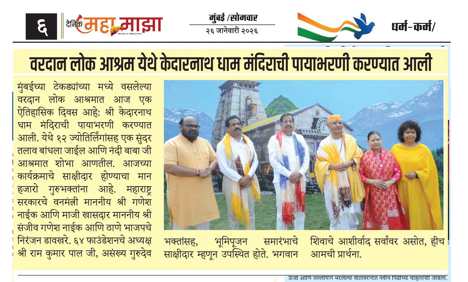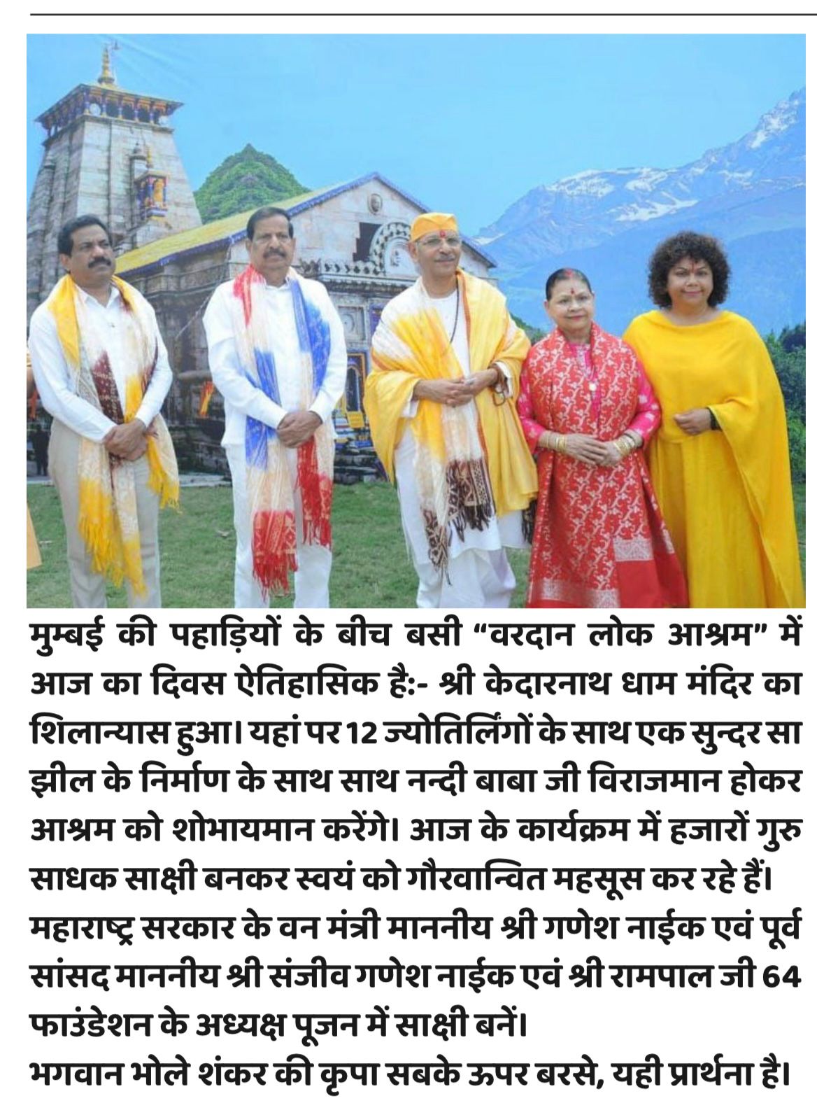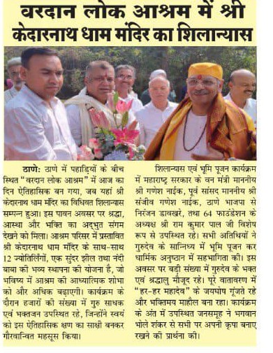 The foundation stone laying ceremony for the Kedarnath Dham temple was formally completed at Vardaan Lok Ashram, nestled amidst the hills of Mumbai. This event was of immense religious and cultural significance. The program was graced by the presence of saints, political representatives, and devotees. The construction of the Kedarnath Dham temple, along with replicas of the 12 Jyotirlingas, was pledged within the ashram premises. This temple will not only serve as a center of devotion but also as a symbol of spiritual consciousness and the preservation of cultural values. This foundation stone laying ceremony will further strengthen the identity of the ashram in the years to come.