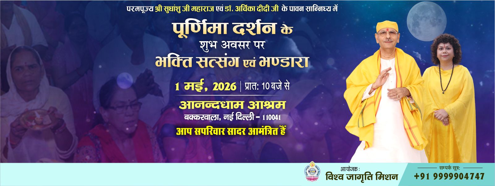 On the auspicious occasion of Purnima Darshan, you are cordially invited to attend Bhakti Satsang and Bhandara in the divine presence of Param Pujya Shri Sudhanshu Ji Maharaj and Dr. Archika Didi Ji.