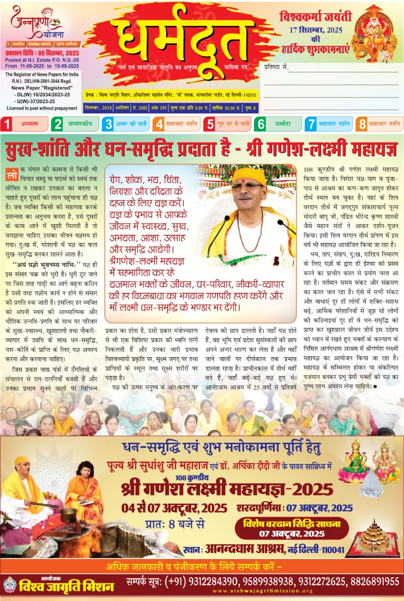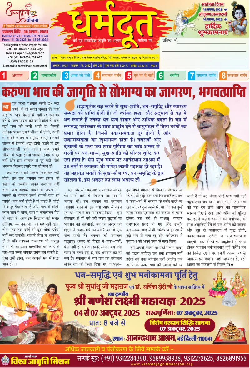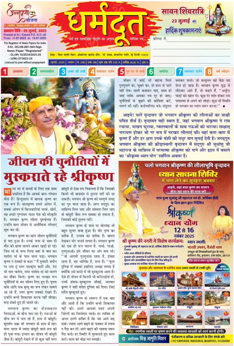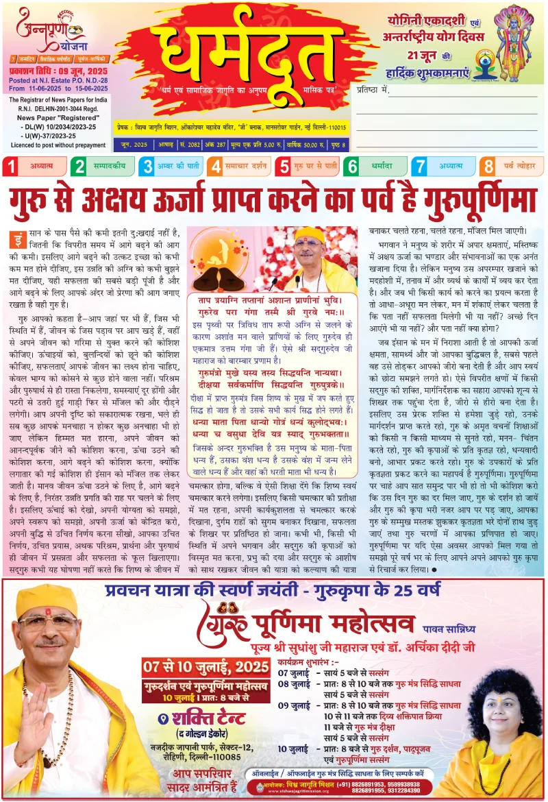 The Divine E-Newsletter is a monthly publication from the Vishwa Jagriti Mission, guided by the blessings of Param Pujya Shri Sudhanshu Ji Maharaj. Each issue embarks on a spiritually enriching journey, dedicated to inner awakening and selfless service. Through Satsang's, meditation sessions, and social initiatives, the Mission continues to inspire seekers across the globe to live a life of compassion, discipline, and divine consciousness.