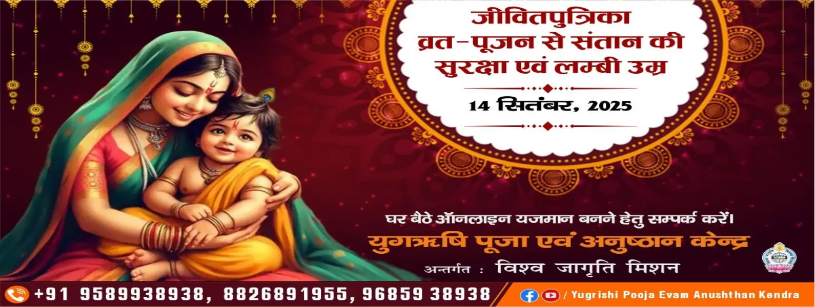 In order to get the virtuous results of the worship-recitation, yagya-anushthan of Jivitputrika Vrat at home, with the blessings of the most revered HH Shri Sudhanshu Ji Maharaj, Yugrishi Pooja evam Anushthan Kendra is organizing the worship of Jivitputrika Vrat at AnandDham Ashram Delhi on the auspicious festival of Jivitputrika on Sunday, 14 September 2025.